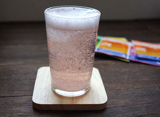 これをまず、正統派の飲みかたで飲んでみようと、パッケージの絵を参考に炭酸水で割ってみたんですが、あとから思ったけどこれ、粉自体にシュワシュワ要素があり、普通に水で割ればいいのかも。