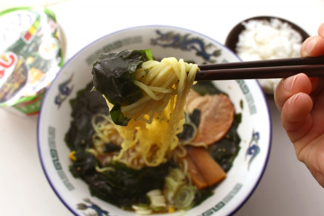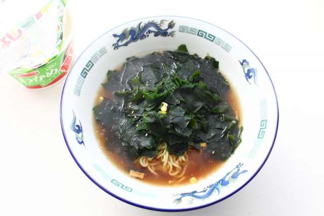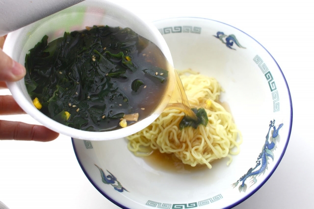 中華麺を茹でたら、独特のかん水の匂いがして、そこに麺なしわかめラーメンを注いだら、わかめラーメンの完成ですよ。