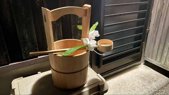 ②元日の午前4~5時頃、家の中から選ばれた女性がひとりで柄杓と桶を持って水源に向かう。