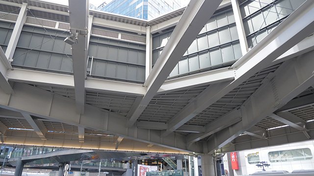 八馬:駅前の広場って、すごく制約があるんですよね。バスターミナルがあって、タクシープールがあって、一般車両が通る道があって、となると、橋脚を入れられる場所というのが限定されて、無理をした構造になりやすいんですよね(※)。距離を飛ばすためには桁の部分を分厚いものにしなければいけない。そうしないと荷重に耐えられないから。