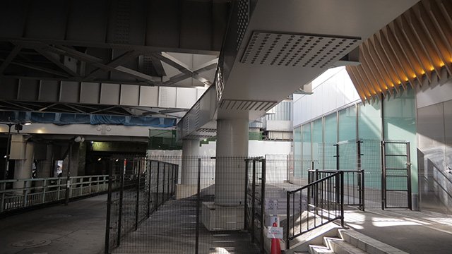 八馬:もしかしたらこれは仮設かもしれないですね。奥にある黒い歩道橋が完成形だとすると、そこに接してますよね。なのでこれは仮の構造物なんじゃないかなという気がしてきました。
