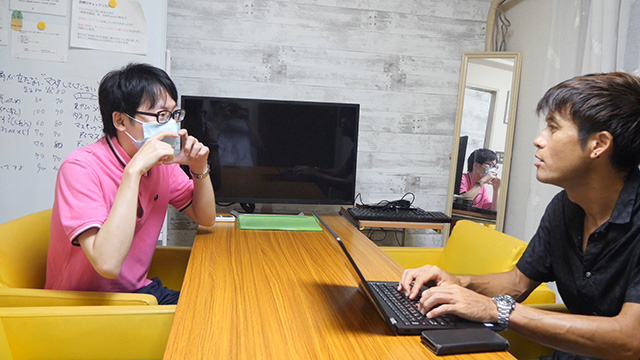 左の藤原くんが右の安藤さんにマスクしてくださいと角が立たないように言います