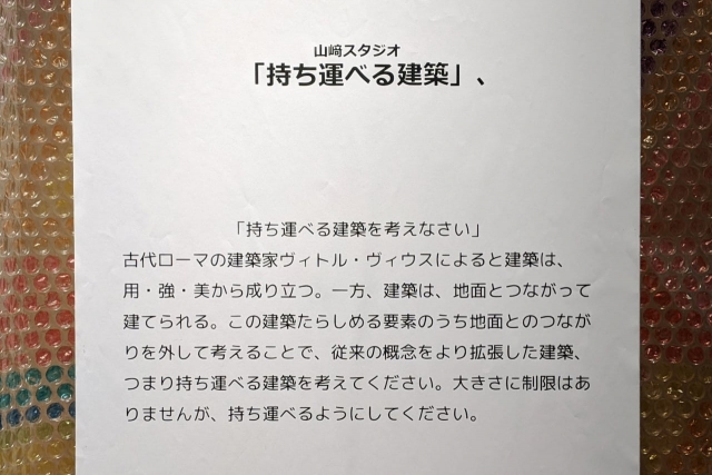 最初は「持ち運べる建築」という課題だ。出題は山﨑健太郎先生。この授業では全部で4人の教授が出題をする。
