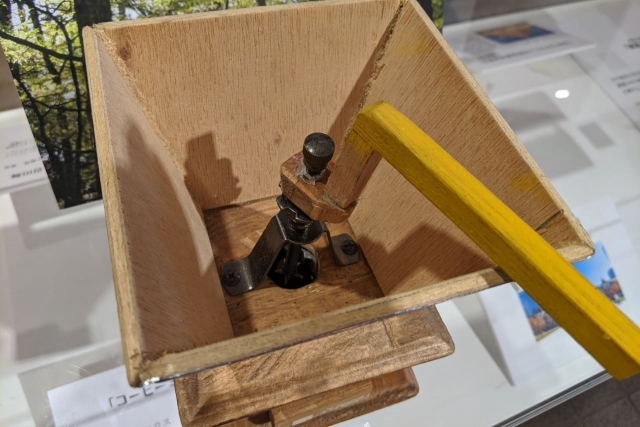 土台の部分に歯車が埋まっていて、取っ手をまわすと「ゴロゴロ」と重い音で回るのだ。本物のコーヒーミルからとってきた金具かもしれない。