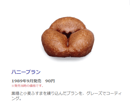 香ばしい楕円形の生地が3つくっついて三角形になっているドーナツです。ハニーブランは普通のブランにシュガーコーティングしてあるものです。