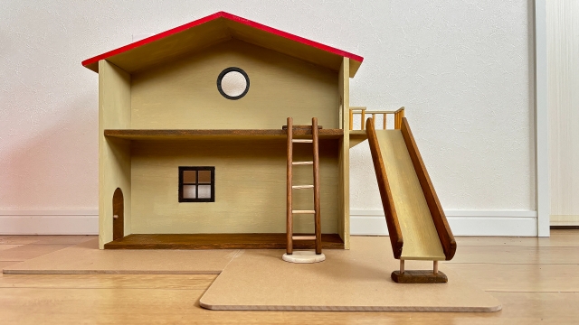当初は階段を予定していたが、お人形が登れる幅の階段を作ると材料の切り出しや組む作業がとても大変になりそうなことがわかり、急遽ハシゴに変更した。