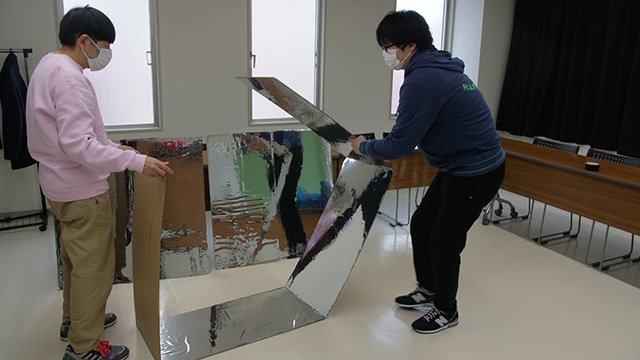 ダンボール板にミラーを貼ってみるとここでも挫折がある。ダンボール板は独特の凹凸がありたわみもある。妥協の城が組み上がっていく。