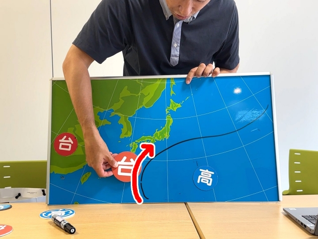 太平洋高気圧がドーンとありまして、この高気圧というのは、時計回りに風が吹いていますので、時計回りのこの風に流されて、だんだん北上してくるということですね。