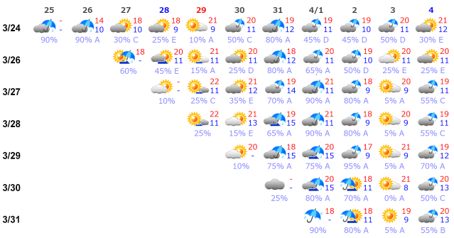唯一、変わったところは3月24日の時点では、3月30日から4月3日までずっと雨だったのが、近づくにつれて4月3日の晴れが現れている。