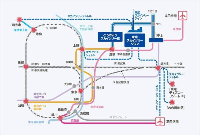 東京スカイツリーへの電車アクセスを示していて、JRや地下鉄、私鉄が記載されている。パッと見、普通の交通案内。