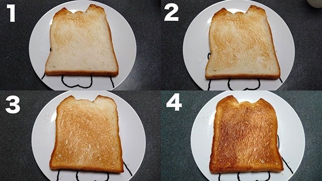私は食パンを焼くときは必ずトースターの前に立ち、焼き上がるまでパンの表面を確認しています。なぜなら、このくらいの焼き加減だと少し目を離したら真っ黒になってしまうからです。毎回、ギリギリの戦いをトースターとしています。