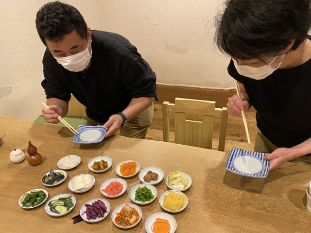 妻「ずっと飲んでられるセレクトです。最初からこれだけでもいける、っていうのと彩りも意識して。柴漬けと、シソの実とかキュウリを刻んだこの緑のやつが好きなんですよ」