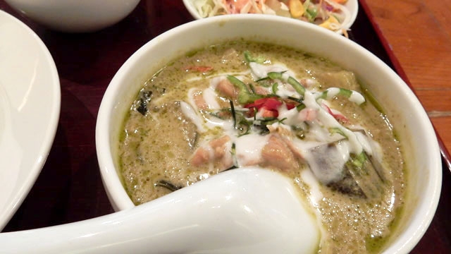 黄色っぽい薄い茶色は今まで何度か出てきたが、中でも明るくて黄色が強い茶色だと思った。グリーンからは遠い。しかしそれはラーメンだからではなくて、たまたまそういうグリーンカレーをスープに使ったのだな、と今なら思う。