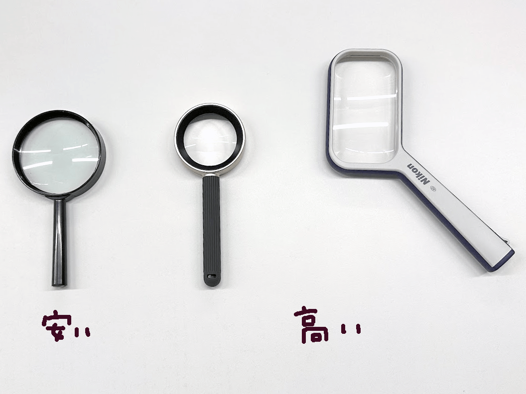 カメラメーカーのルーペがどれほど良いのか気になったので買ってみました。比較のために100均でも買ってあります。