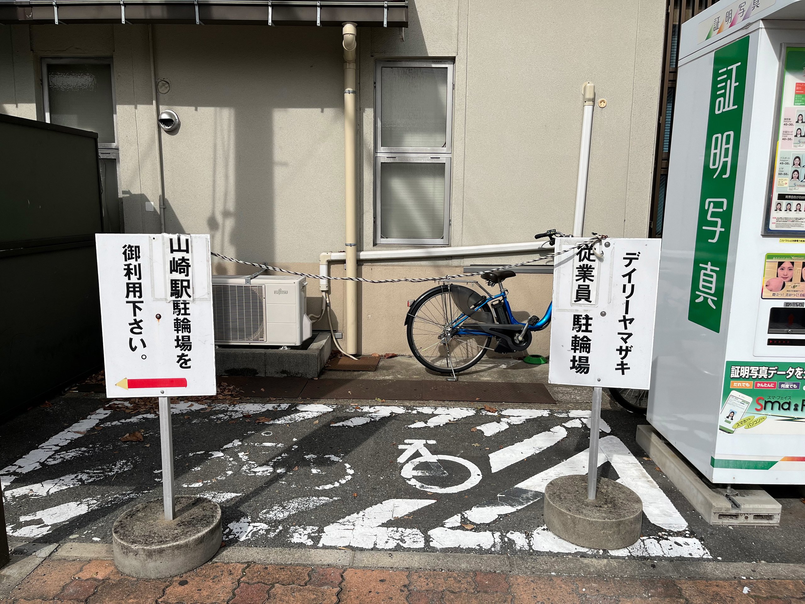 駅の脇にはデイリーヤマザキ従業員用の駐輪場があり、山崎駅の駐輪場ではないことを示す看板が立っていました。どっちも山崎なので、紛らわしいことになっていました。