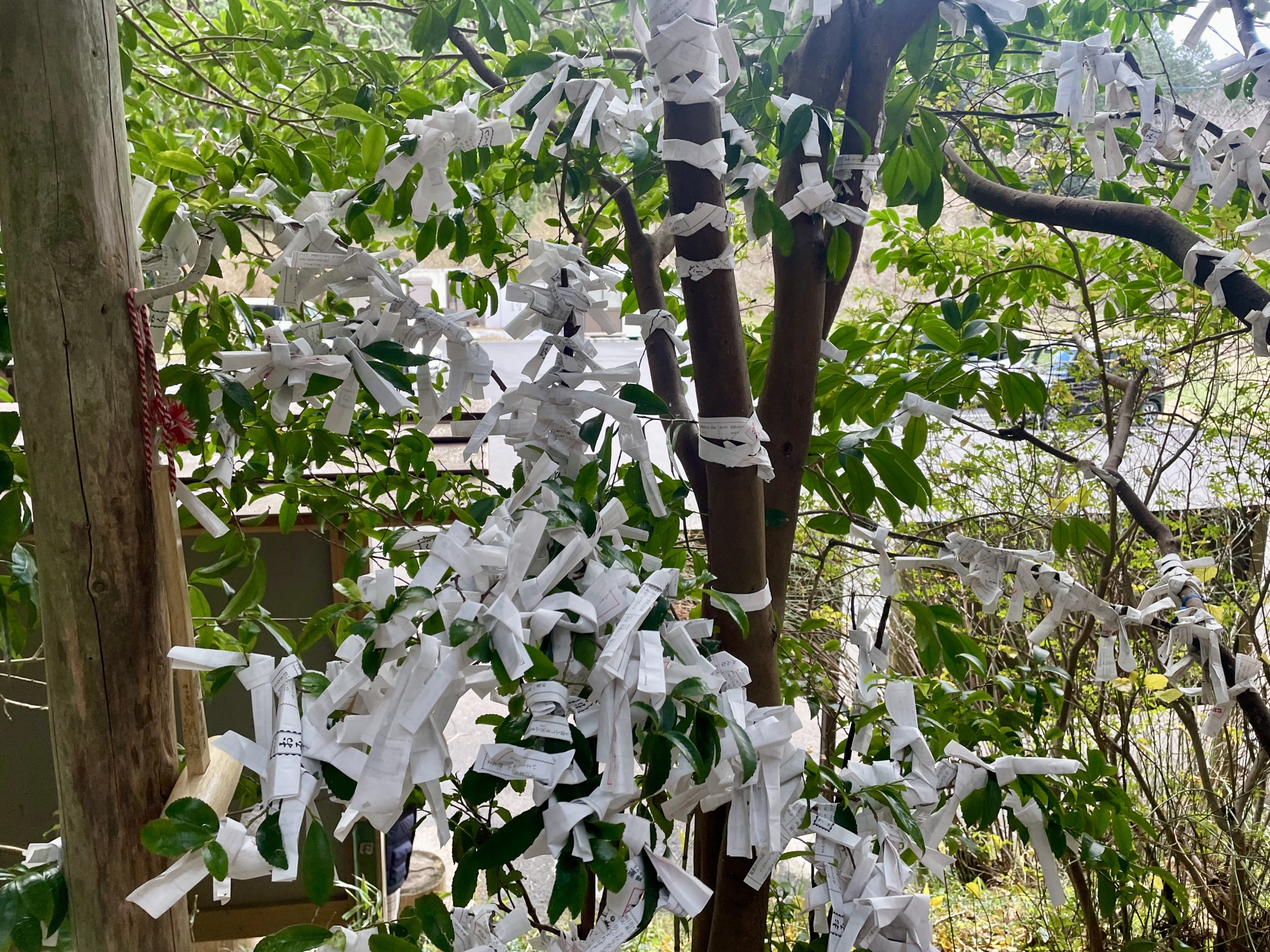親戚が神職を務める神社で、おみくじがたくさん木に結ばれていました。