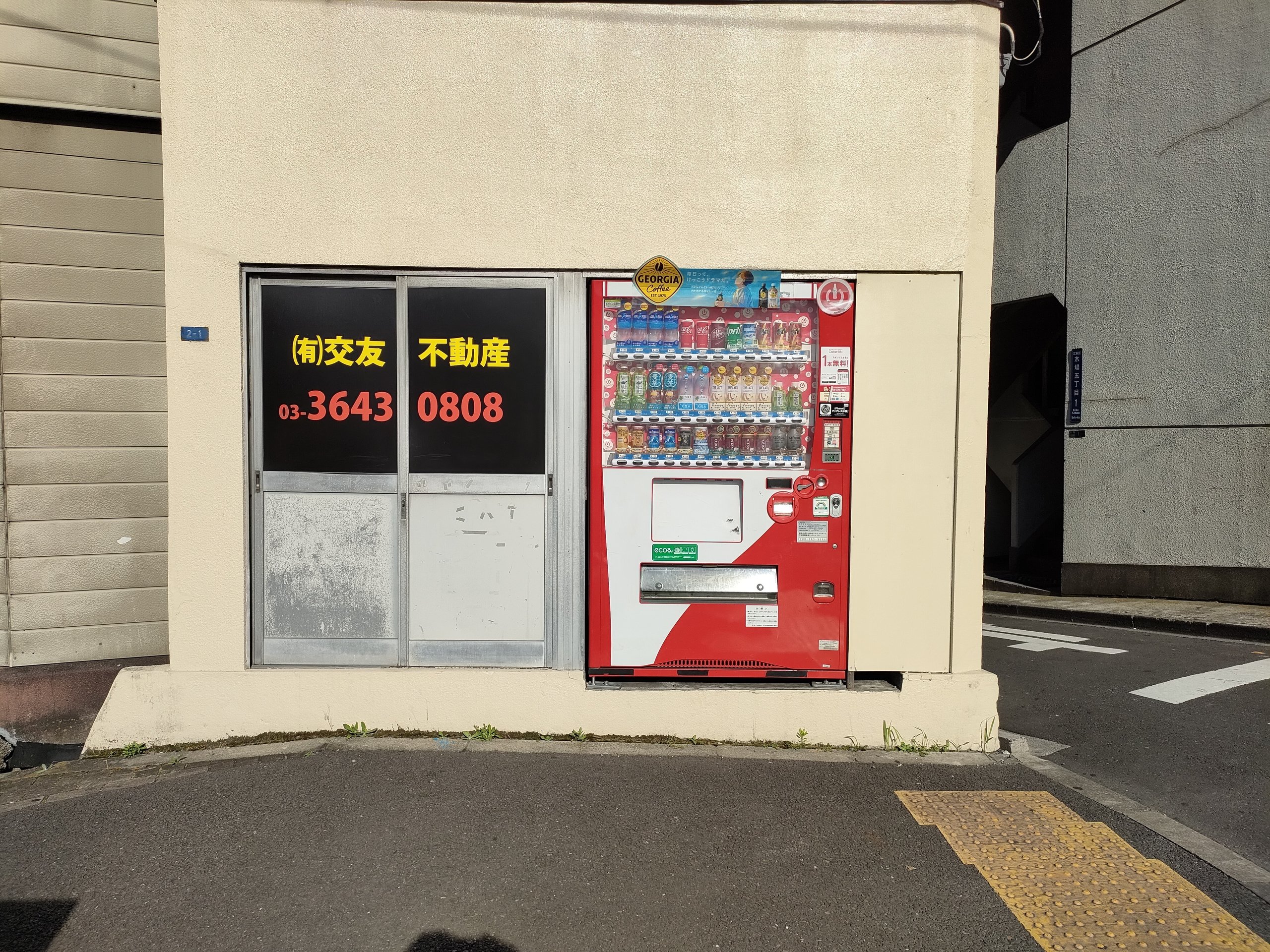 かなりすれすれの隙間にぴったり入っている自販機を見つけました。