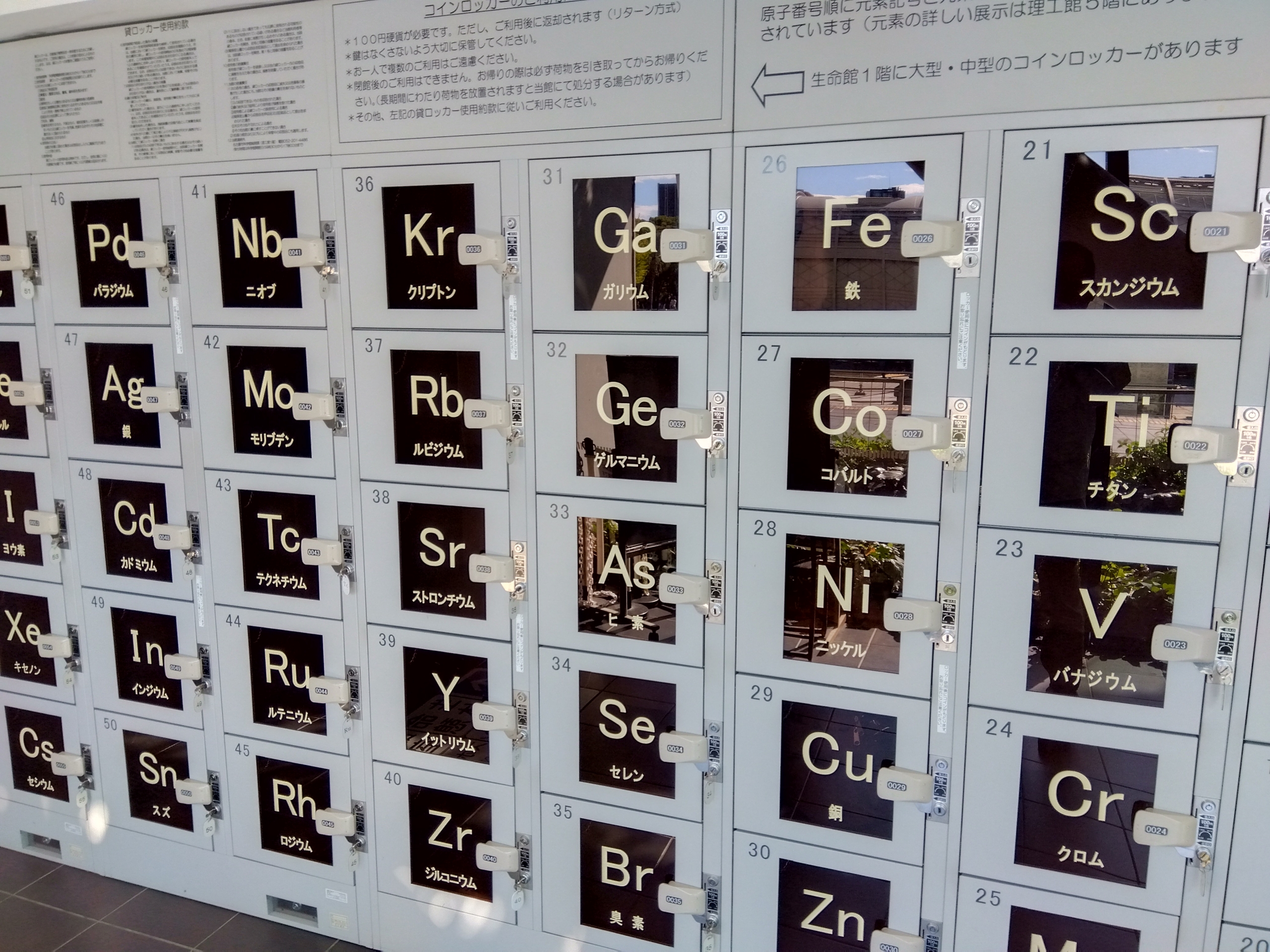 名古屋市科学館のコインロッカーに荷物を預けに行くと、それぞれのロッカーに元素記号が記載されていました。どの元素に入れようかと思わず悩んでしまいました。