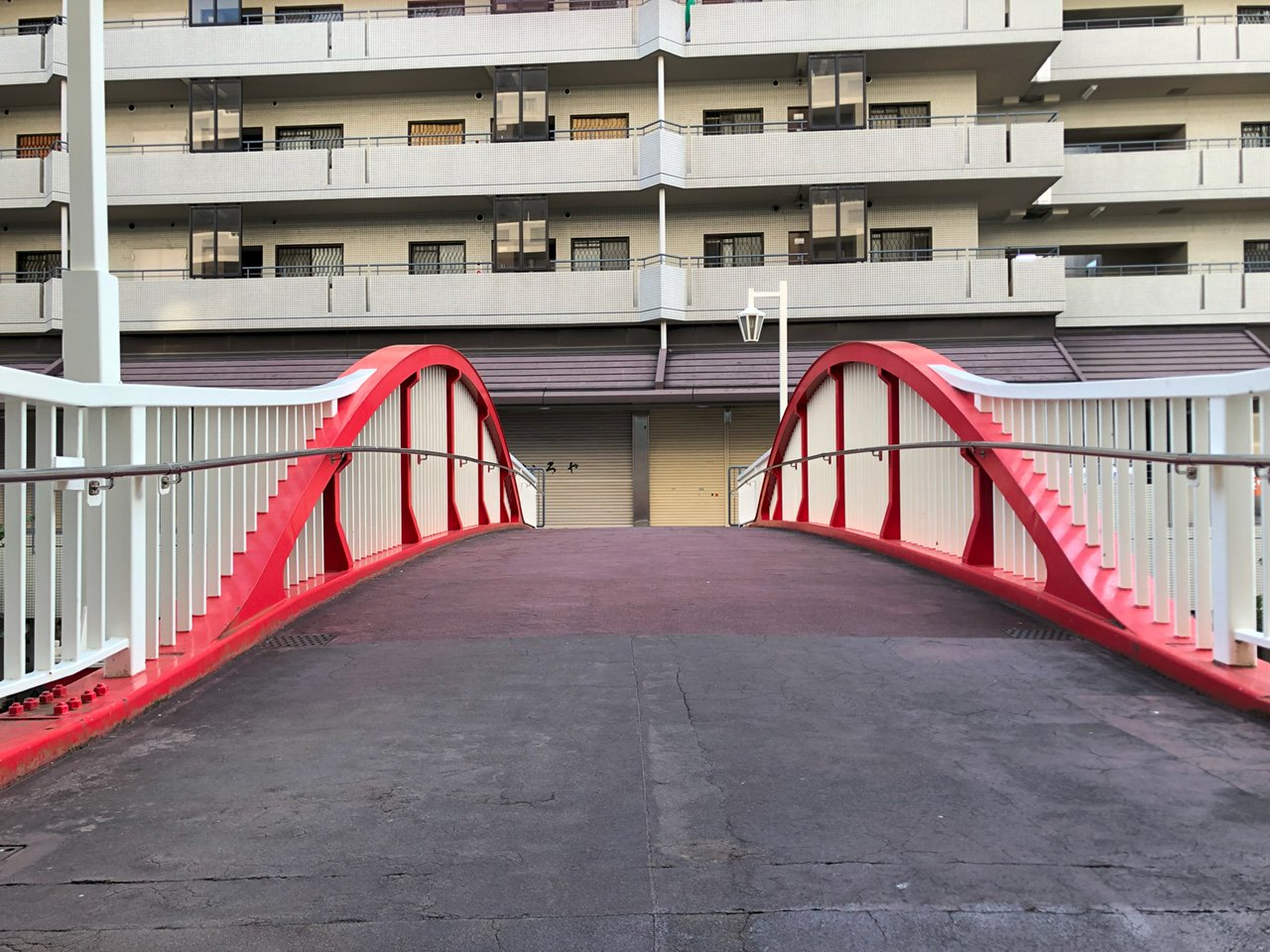橋の柵の部分を「高欄」というそうですが、高欄の一部、アーチに見立て加工した鋼材を赤く塗ってそれっぽく見せています。ふつうに高欄を作ってもいいところを、なんとも凝ったつくりになっていました。