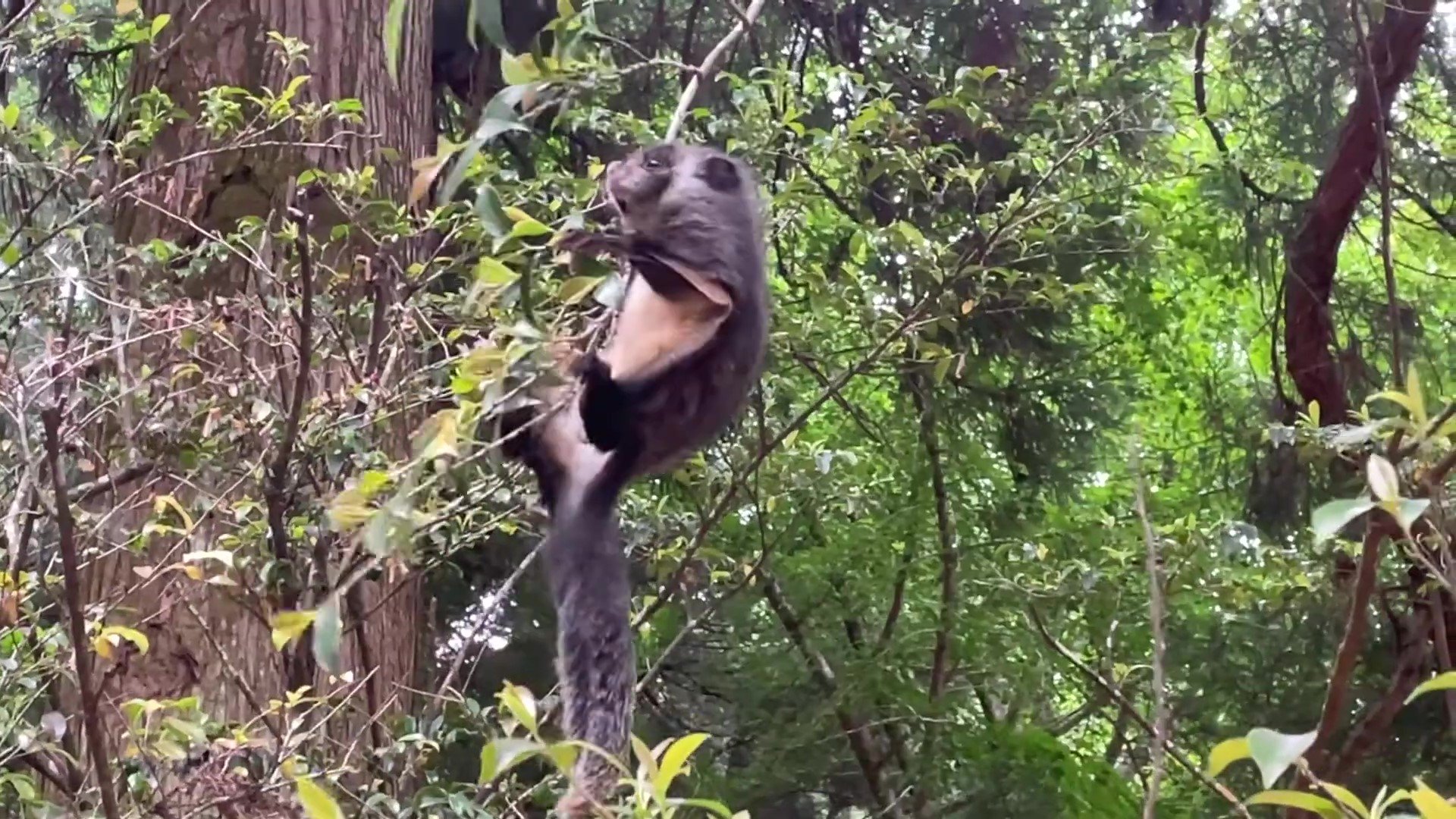 一生懸命に枝に捕まっていたムササビは、危機が過ぎ去ると地上に降りてきて物陰に隠れた。まだ小さくて上手に木登りができないのかもしれない。