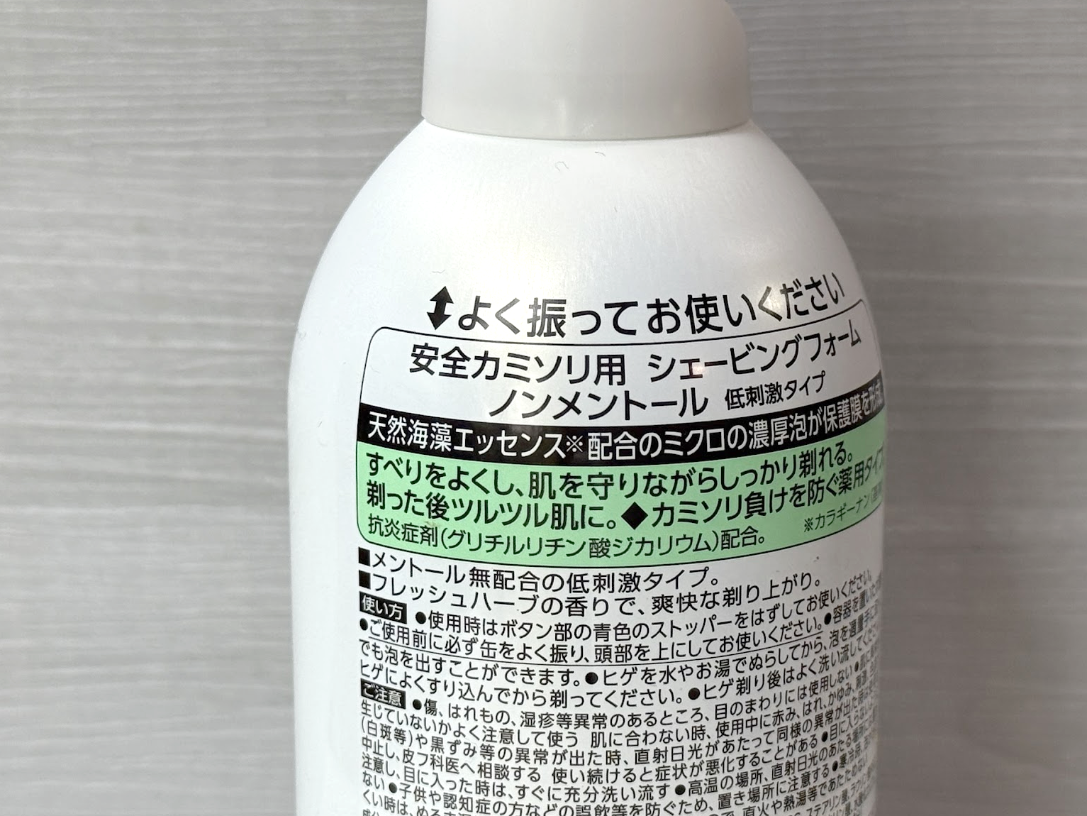 男性用化粧品はたいていメントールが入っています。でも見つけました。メントールが入ってないシェービングフォームです。