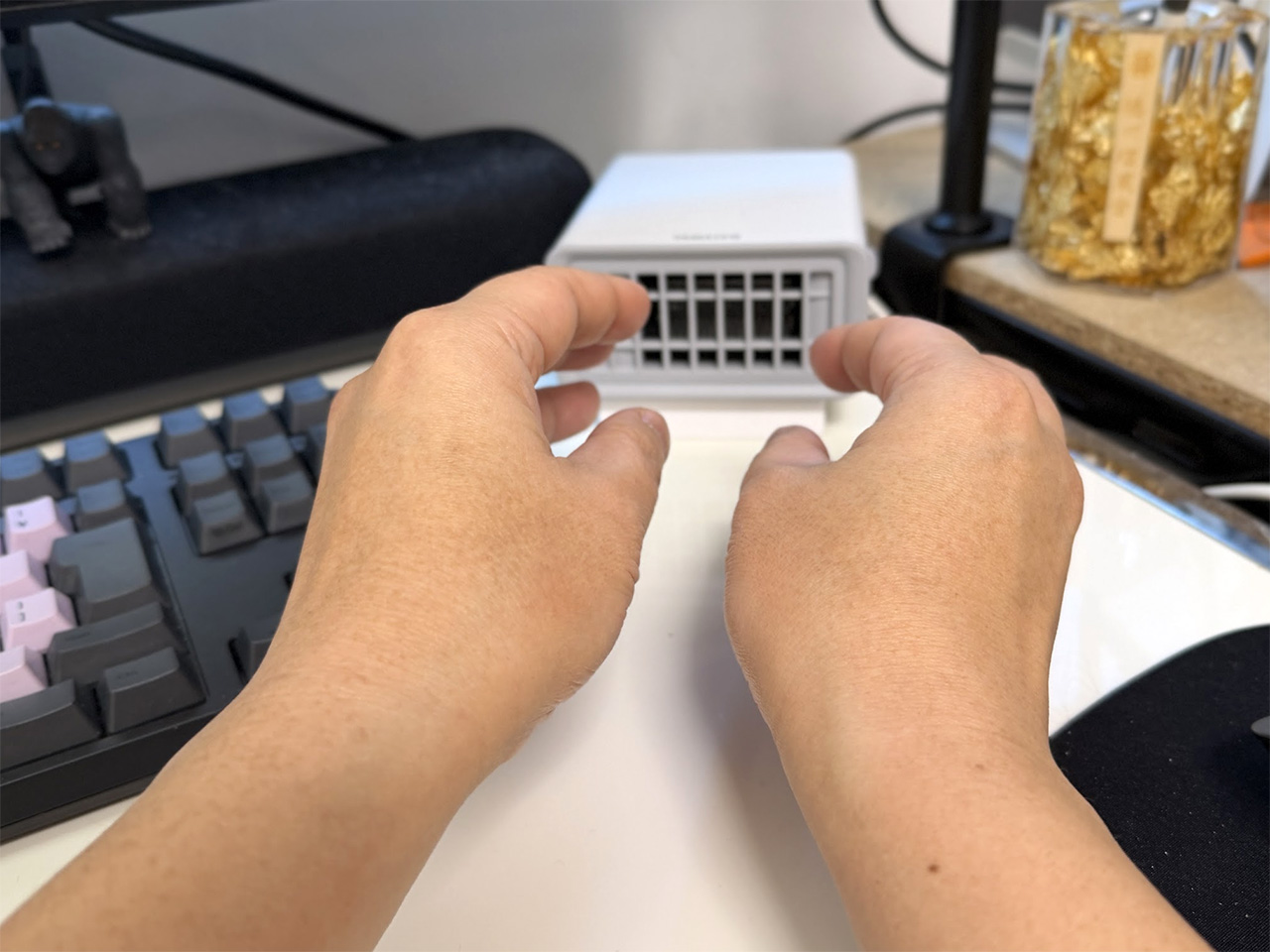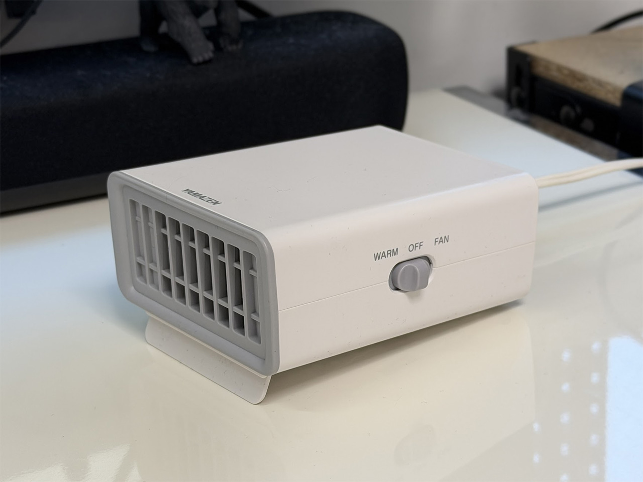 暖房器具のようにずっと使うのではなく、手先だけすぐに暖めたいときに一時的に使っています。しばらく温風にあてて手が動くようになったら電源を切って仕事再開です。