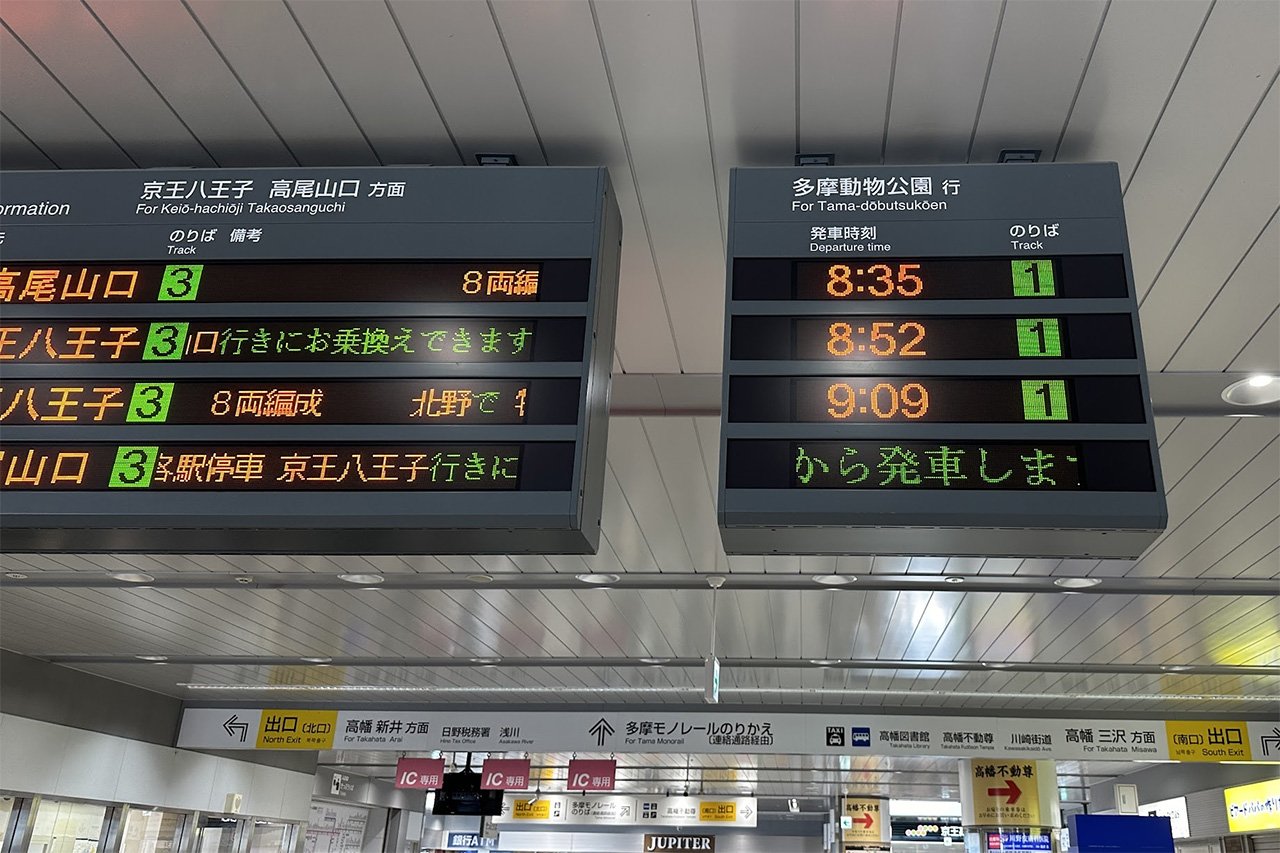 高幡不動駅にあった電光掲示板。多摩動物公園行の電車の時刻です。