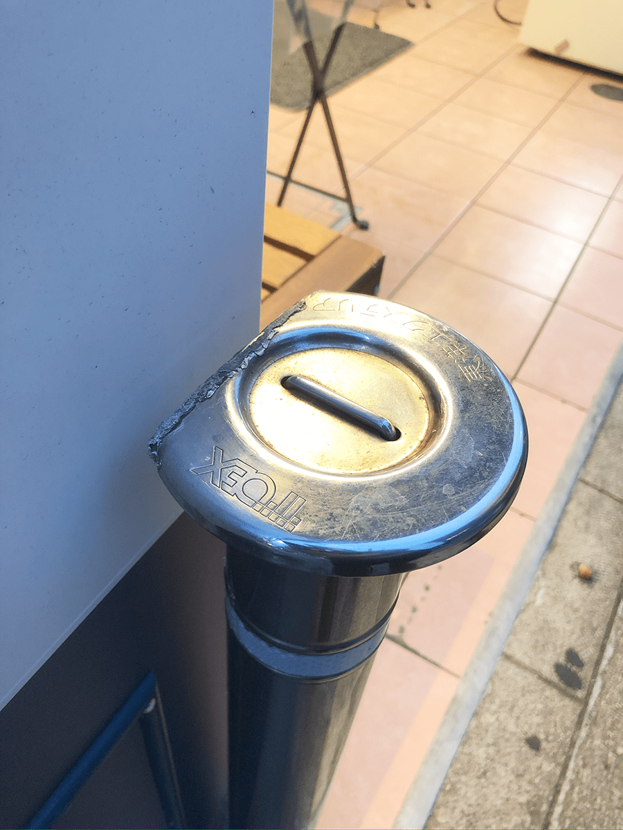 3年ほど経って、2021年に同じ場所を通りがかると、手前の店舗が別の店に変わって、車止めポールの埋め込まれていた部分がぶった切られていました。