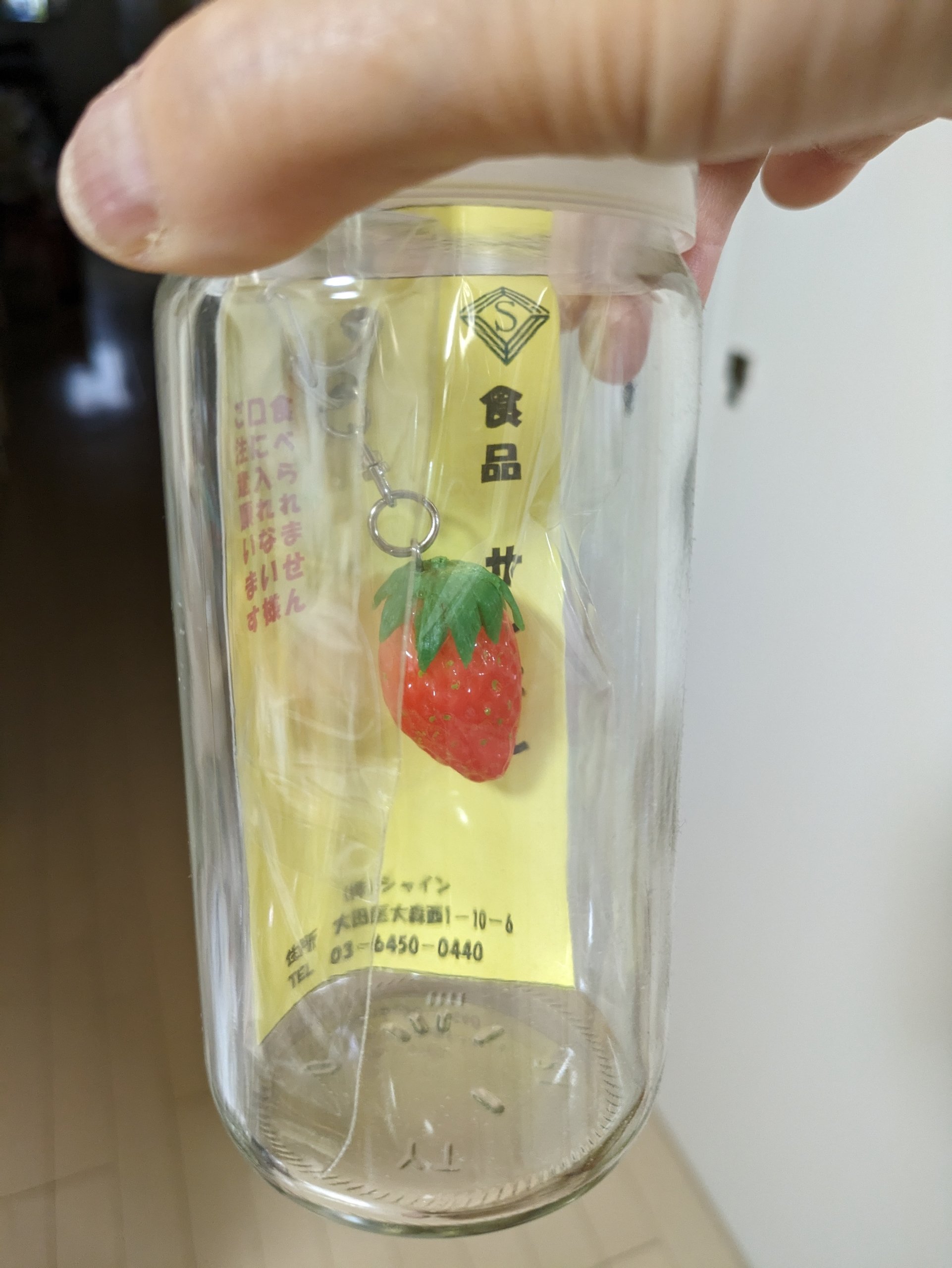 サンプルの中身は枝豆、ホットケーキ、みかん、いちご、芋天。興味本位で買ってみたらキンキンに冷えた瓶に入ったいちごが出てきました。
