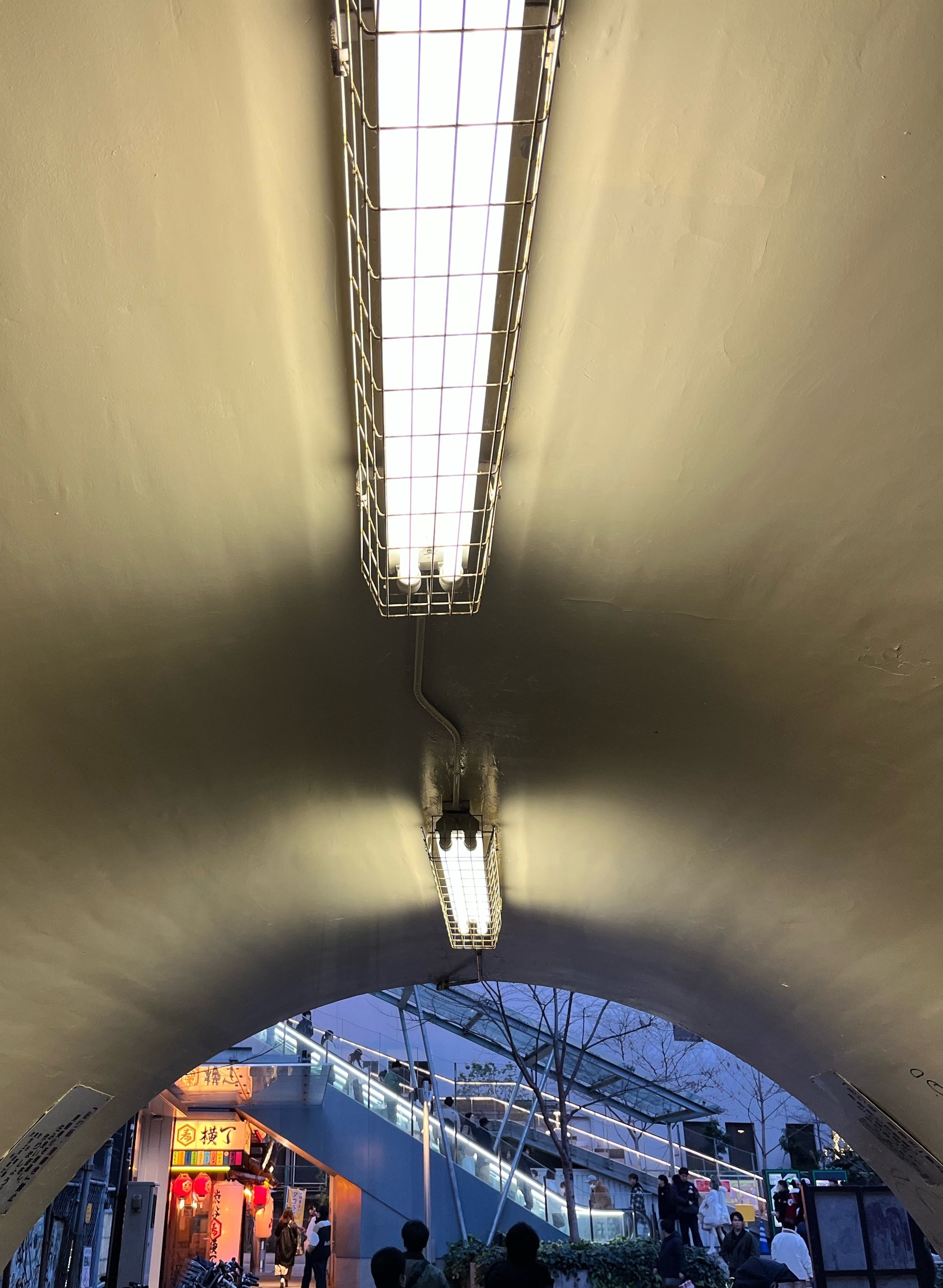 渋谷の公園通りから宮下公園の南側の入口に向かうとき、JRのガード下をくぐるトンネルを通りますがこのトンネルの天井に付いている照明がなぜか真っ直ぐではなく曲がって設置されています。