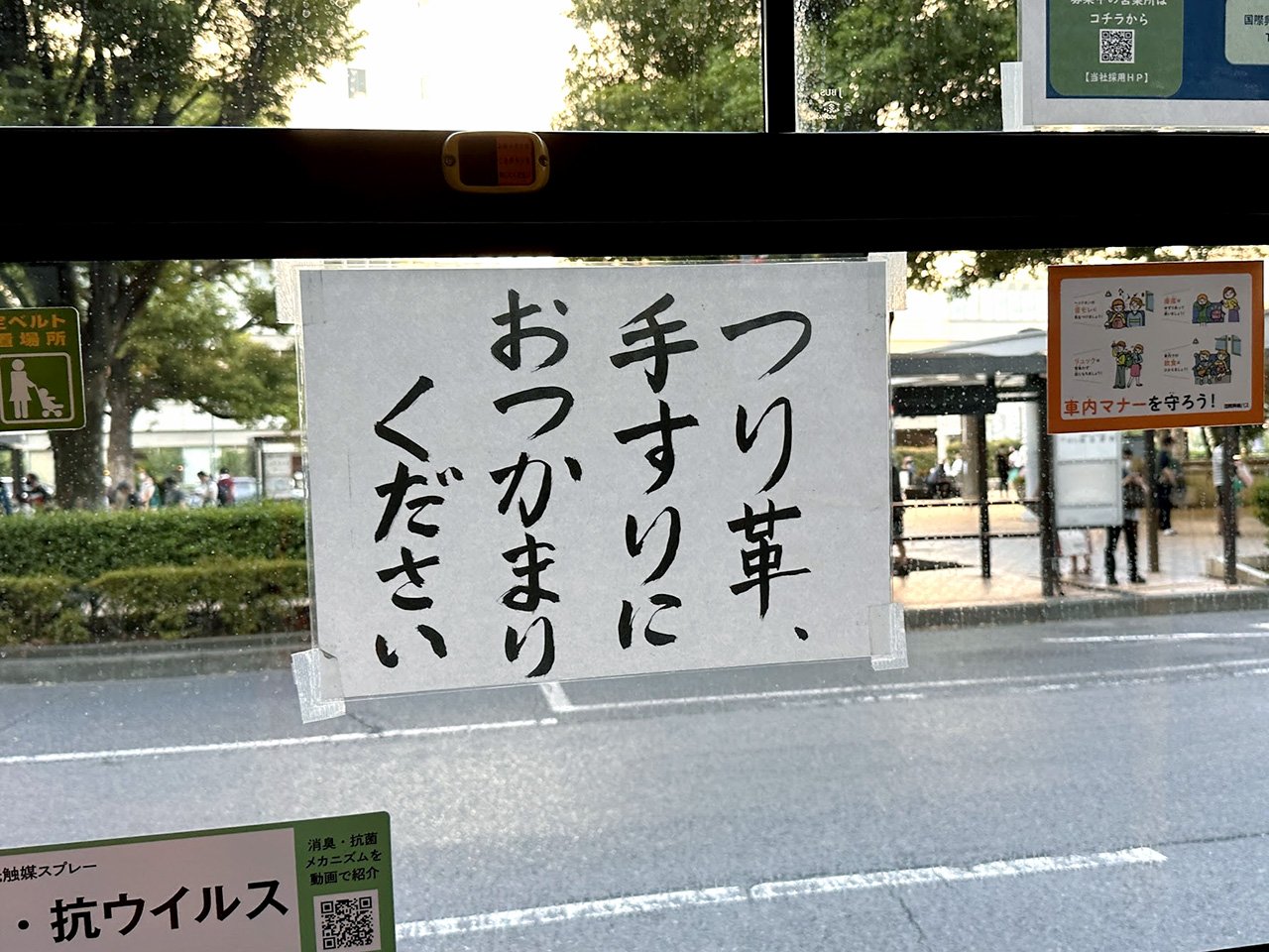 他のバスにも同じ貼り紙があったので、このバスの運転手が描いたものではないようだ。会社か営業所として貼っているのだろう。