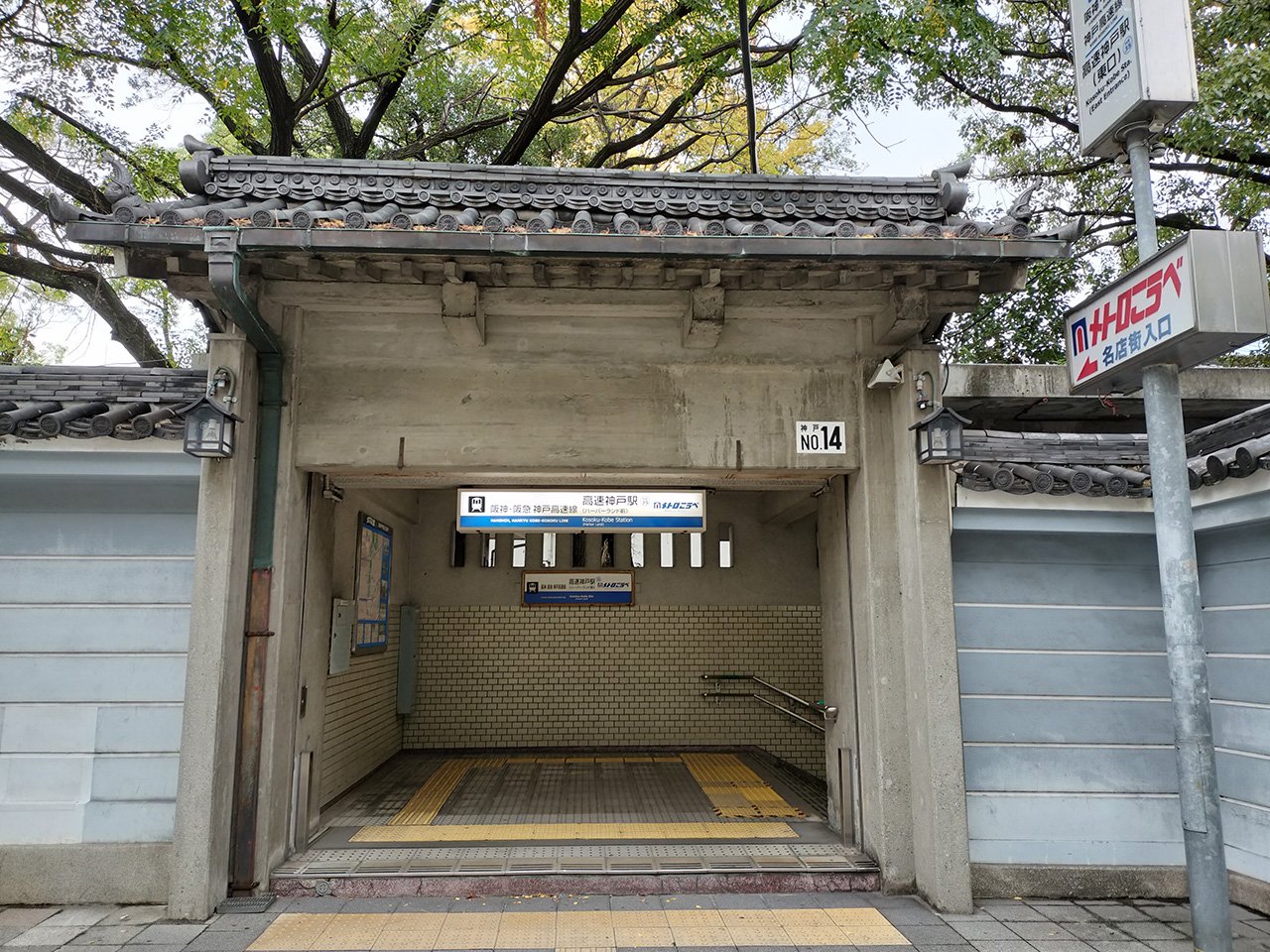 この入口が湊川神社という大きな神社の敷地内にあるため、このような造りになっているようです。ひと続きの塀の一部分に突然駅の入口が現れるので、初見だと頭がちょっと混乱しますね。