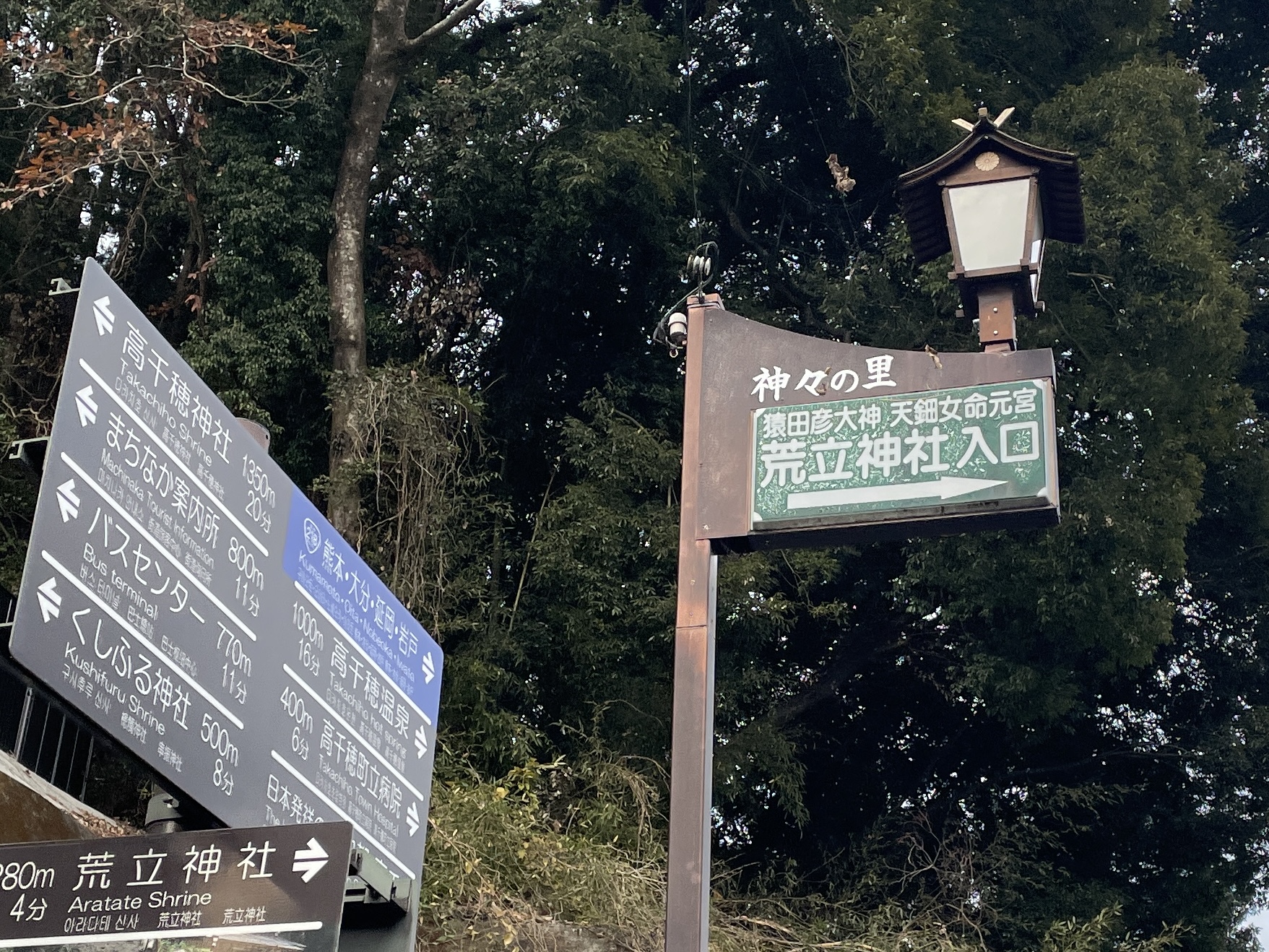 高千穂の町中には地元の企業や店舗を紹介する街路灯が並んでいます。