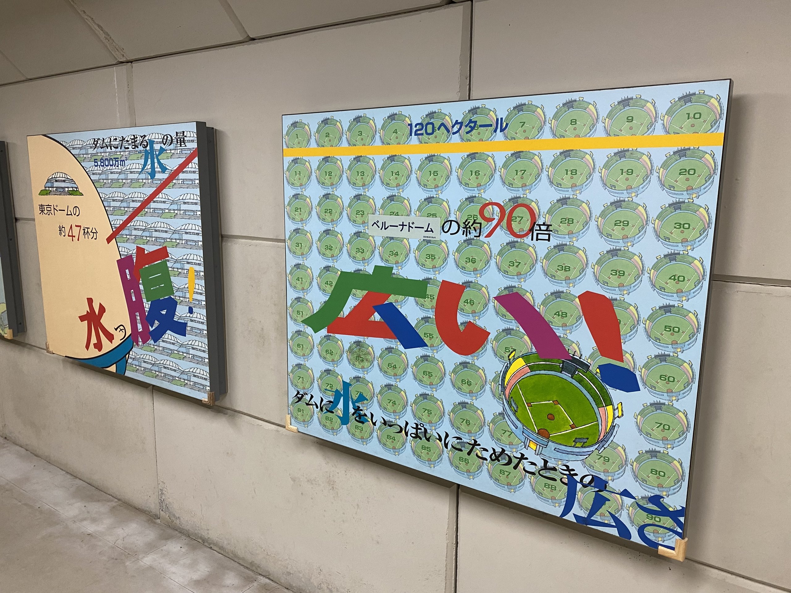 しかし隣のパネルでは水量の説明に東京ドームを使っている。やはりベルーナドームには壁がないからだろうか。