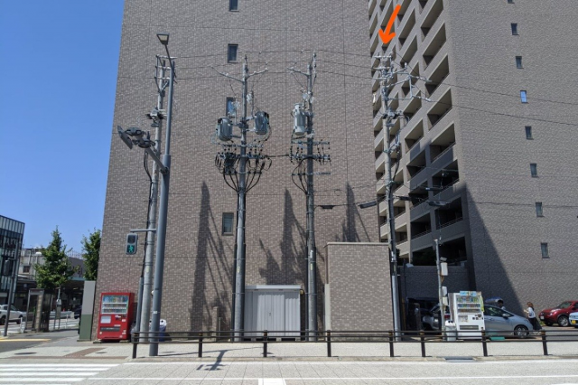 東岡崎駅前の電柱。見えづらいですが、よく見るとこの距離に4本も並んでます(一番右側に矢印を描きました)。 ふつう30m程度は離れるのでいくらなんでも近すぎます。変電所かと思いました。 周辺では無電柱化計画が進んでるようなので、抜かれた電柱の怨念が化けてでているのかもしれない。