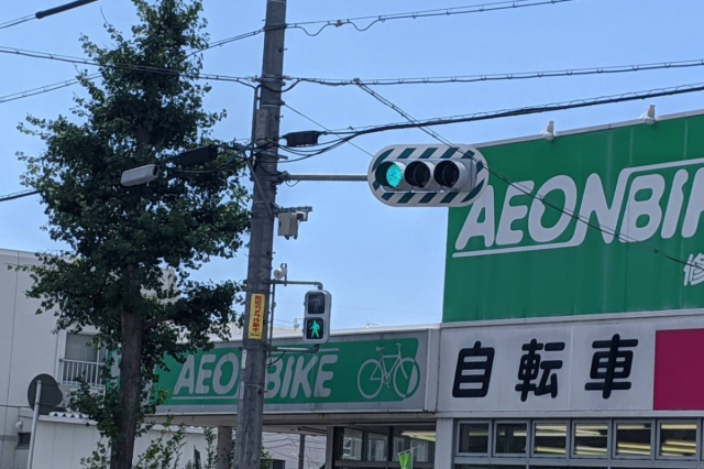 通称「ゼブラ板」とも呼ばれるシマシマの板がついた車両用信号機です。昔はよく設置されてたようなんですが今では稀なので見かけると嬉しいです。 主に信号機を見やすくするためのものなんですが、ここで残ってる理由はなんでしょうね。奥のお店の看板が一面の緑色なので、それに紛れないようにとか? 仮に、信号機の奥の壁がもろに赤、青、黄の水玉模様とかだったら迷惑でしょうね。バスケのフリースローを邪魔するためにゴール裏で手をひらひらするファンみたいな。