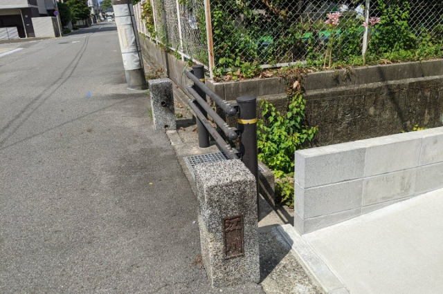 家と家の間に怪しい道があったので辺りを探ったら、橋がかかっていて「江川」と書いてありました。 水面が見えているのは20mくらいだけで、上流も下流もその先は地面の下になっているようでした。つまり暗渠です。 岡崎にも絶対に暗渠あるだろうなと思い、怪しい道があったら片っ端から調べていたのですがなかなか川の痕跡はなく、ここで橋を見つけたときは感激しました。 しかし昔の地図を見ても該当する地図は見つからないですね。地元の図書館とかに行かないとだめかな。