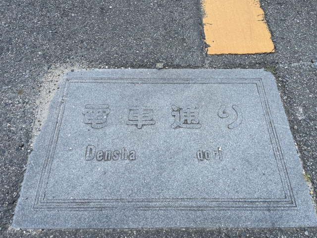 名鉄東岡崎駅へと続く道の歩道に「電車通り」のプレートがあります。もちろん電車は通りません。