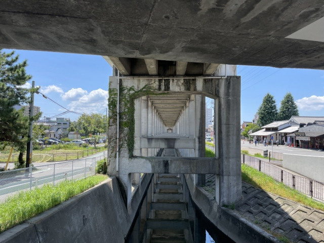 八丁味噌の郷の近く、八帖橋の上から高架下を見ると橋脚が消失点を成していました。