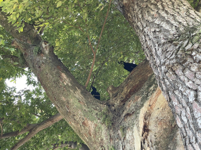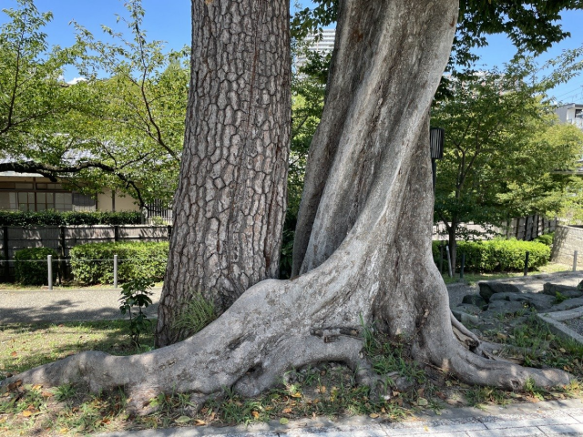 岡崎城近くに、立派な松の木を抱き込んで生えている木がありました。木の上にはカラスが巣を作っていました。
