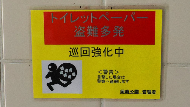岡崎公園で入ったトイレに貼ってあったトイレットペーパーの盗難への警告を促す貼り紙のピクトがめちゃくちゃ悪そうなやつでした。簡略されたピクトなのにトイレットペーパーはやたら細かく描かれていて、よく見ると28個もトイレットペーパーを盗んで逃げています。今までで見た中で一番悪いピクトでした。