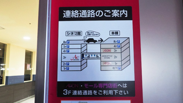 地元の高校生たちが放課後の遊び場として一番使っているというイオンモールへ行ってみました。とにかくでかい!連絡通路の案内にあるように、屋上にあがれば建物と建物の間を車で移動できるようです。実際に屋上にあがってみましたが、どこに行けるのかが分かりやすく、人もあまりいないので、フロアをさまようより一番早く目的地にたどり着けそうだなと思いました。岡崎ライフハックです。