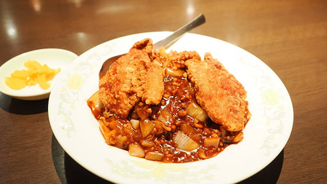 まるで中華街の入り口かとおもう立派な門がまえの萬珍軒。昼間に通った時はちょっと近寄りがたく感じたのですが、夜行ってみると外に人があふれるほどの人気店でした。こちらでは岡崎名物の八丁味噌を使った料理があり、私はその中でも萬珍飯というオリジナル丼をオーダー。ひき肉と食感最高な玉ねぎの入った味噌だれがご飯にかかっており、豚を揚げた肉がのっかっています。めちゃくちゃ美味しいのでみんなに食べてほしい!
