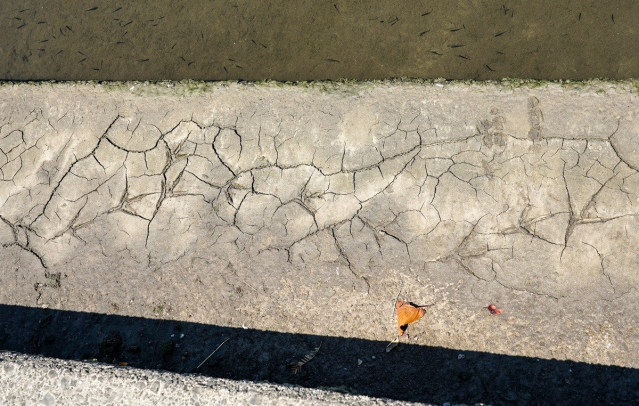 護岸石段の水面近く、砂が堆積してそこをサギが歩いて足あとがきれいに残ります。地形と自然が織りなすアート。常に見られるとは限らないけどけっこう高確率でエンカウントできるのでは。