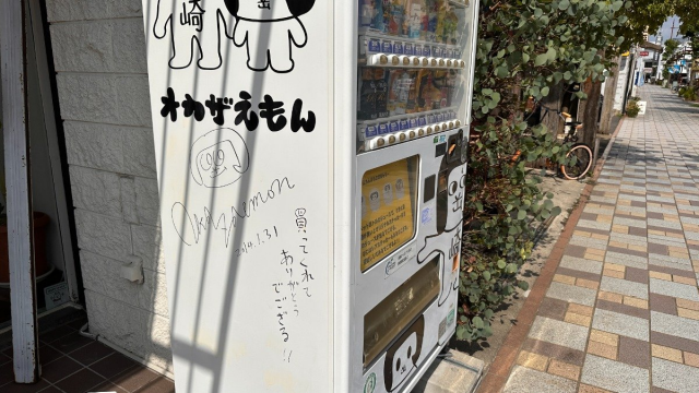 自動販売機にオカザえもんのサインがあります。サインに添えられた自画像がかわいいです。