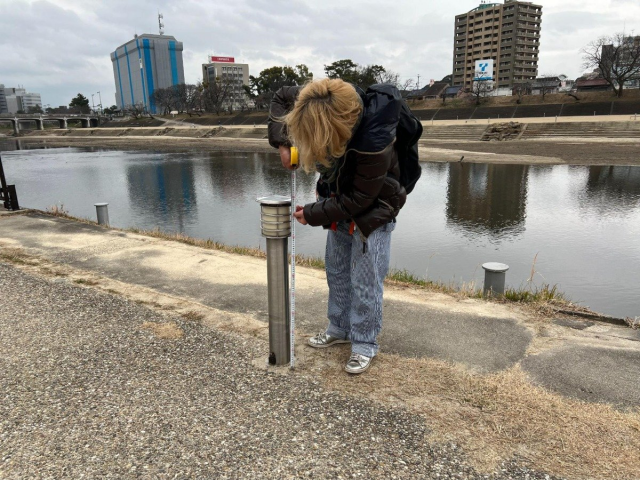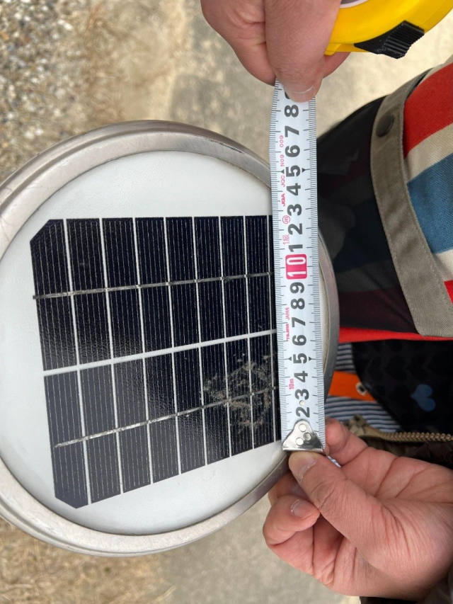 乙川沿いにあったポールの高さはぴったり90cmでした。上にはソーラーパネルがついていて、ここで電気を蓄えて夜になると光るタイプでしょう。ソーラーパネルの幅はぴったり13cm。こちらもきっちりした数字になっていました。