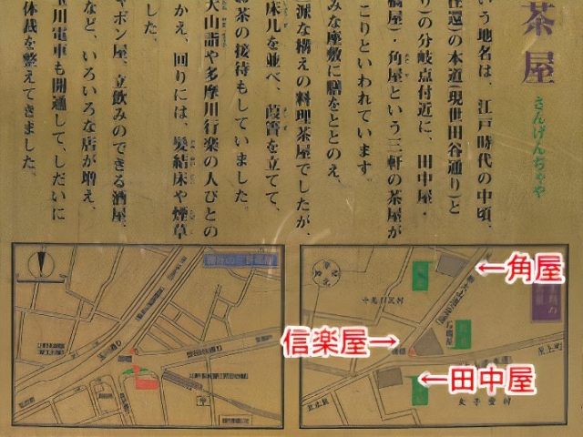 三軒茶屋駅のすぐそばに田中屋、信楽屋、角屋の茶屋がありそのうち一件は跡がある 記事「地名の由来をさがす(デジタルリマスター)(デイリーポータルZ)」より 地名の由来をさがす(デジタルリマスター)